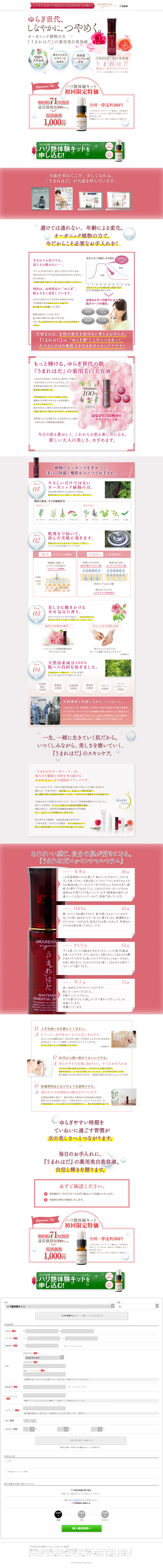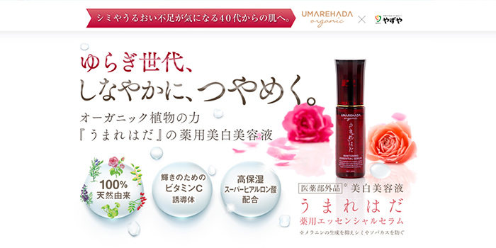 - キャッチコピーは、「ゆらぎ世代、しなやかにつやめく。 オーガニック植物の力「うまれはだ」の薬用美白美容液」