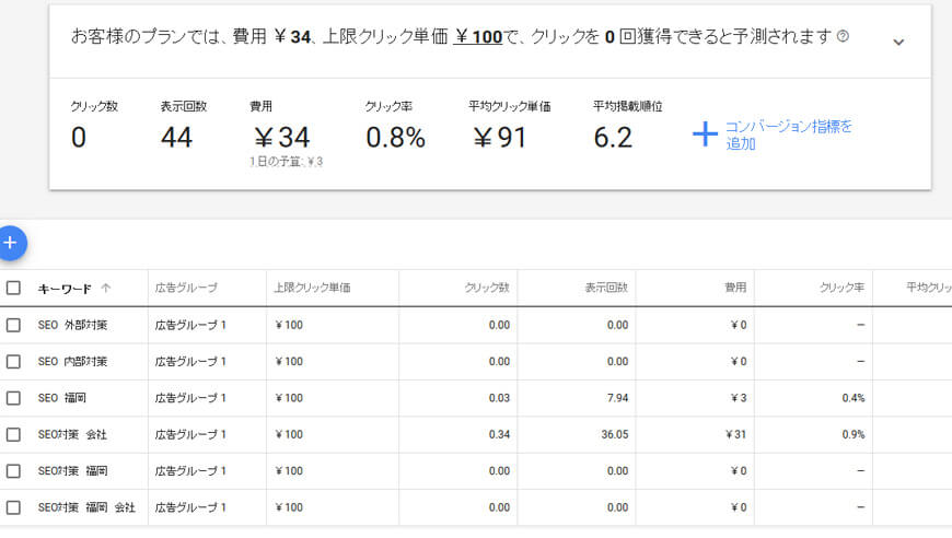 ここでは、「SEO 内部対策」「SEO 内部」等のワードは、検索ボリュームが少ないと見なされ、表示回数が0回と表示されます。「SEO 福岡」は7.94回、「SEO対策 会社」は36.05回となります。