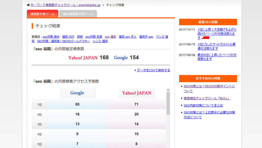例えば、上記で検索数が7.94回と表示された、「SEO 福岡」で見てみるとヤフーでは、164回 グーグルでは、154回となりました。
